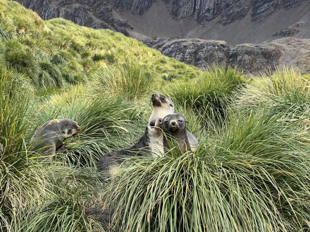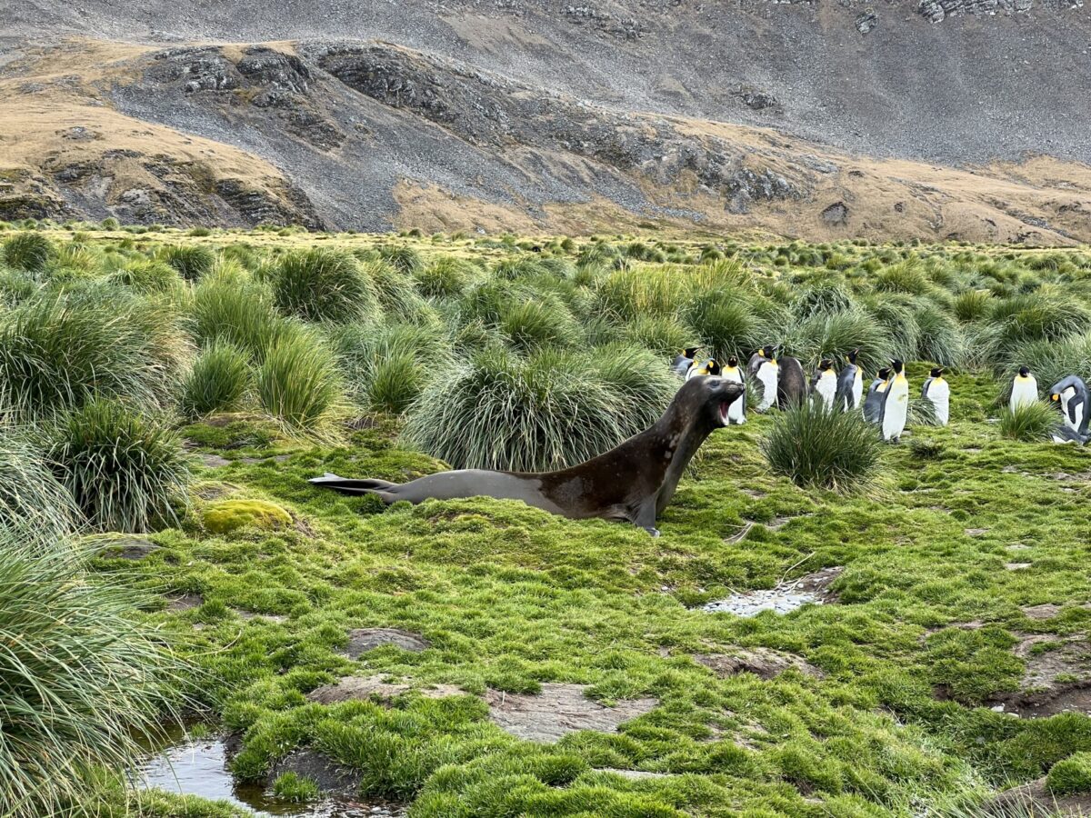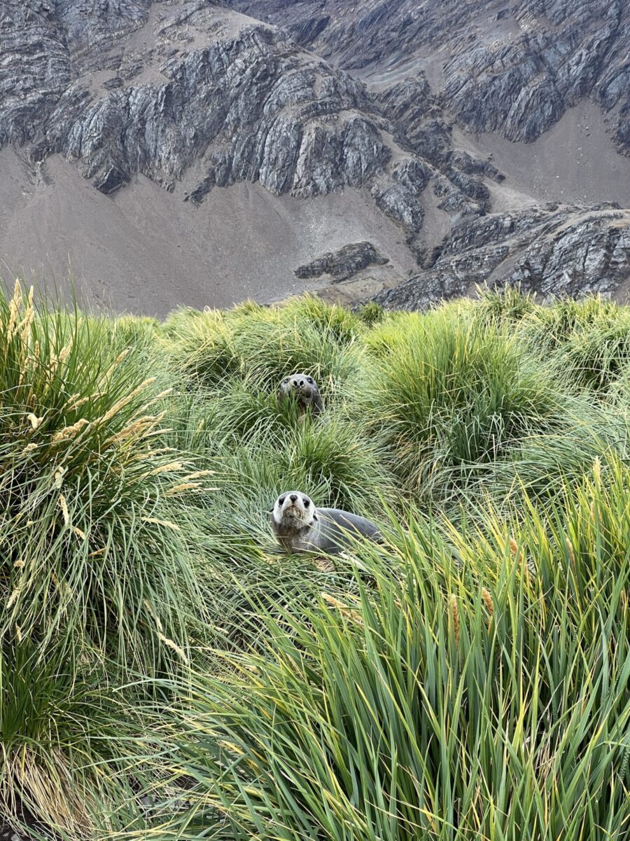 And tussock grass was everywhere! It covered the landscape with bunches of tufted hair. Nestled within the grass were seals and elephant seals, and it made a great home for nesting birds. We got quite a long walk in during this landing and enjoyed all of the heads and eyes peering out at us from the grass.