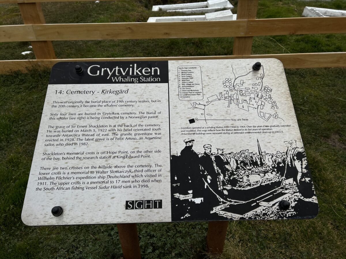 Although that quote definitely fit Shackleton, it was fascinating that they hadn’t included his family’s motto Fortitudine Vincimus—”by endurance we conquer”. While we don’t feel like photos with gravesites are very appropriate, the historian Sandra did talk us into taking one for our memories. Not something we’d ever share on Facebook though, if we even still had Face.. er, Meta.